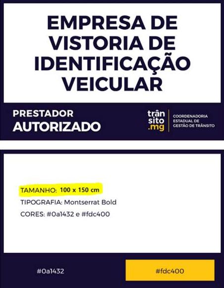 VII – placa de identificação, conforme modelo disponibilizado pela CET-MG, a qual deve estar de acordo com as seguintes especificações: